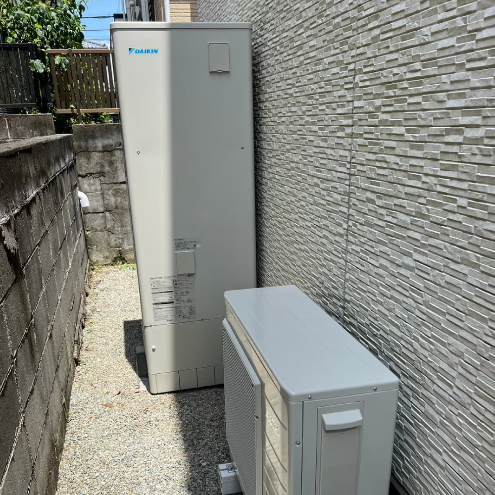 犬走のスペースが広かったので、今回は薄型ではなく、角形のフルオート型エコキュートにて施工させていただきました。