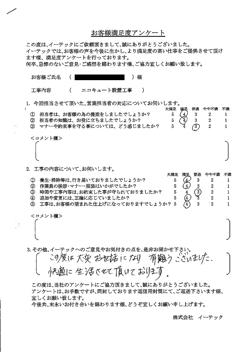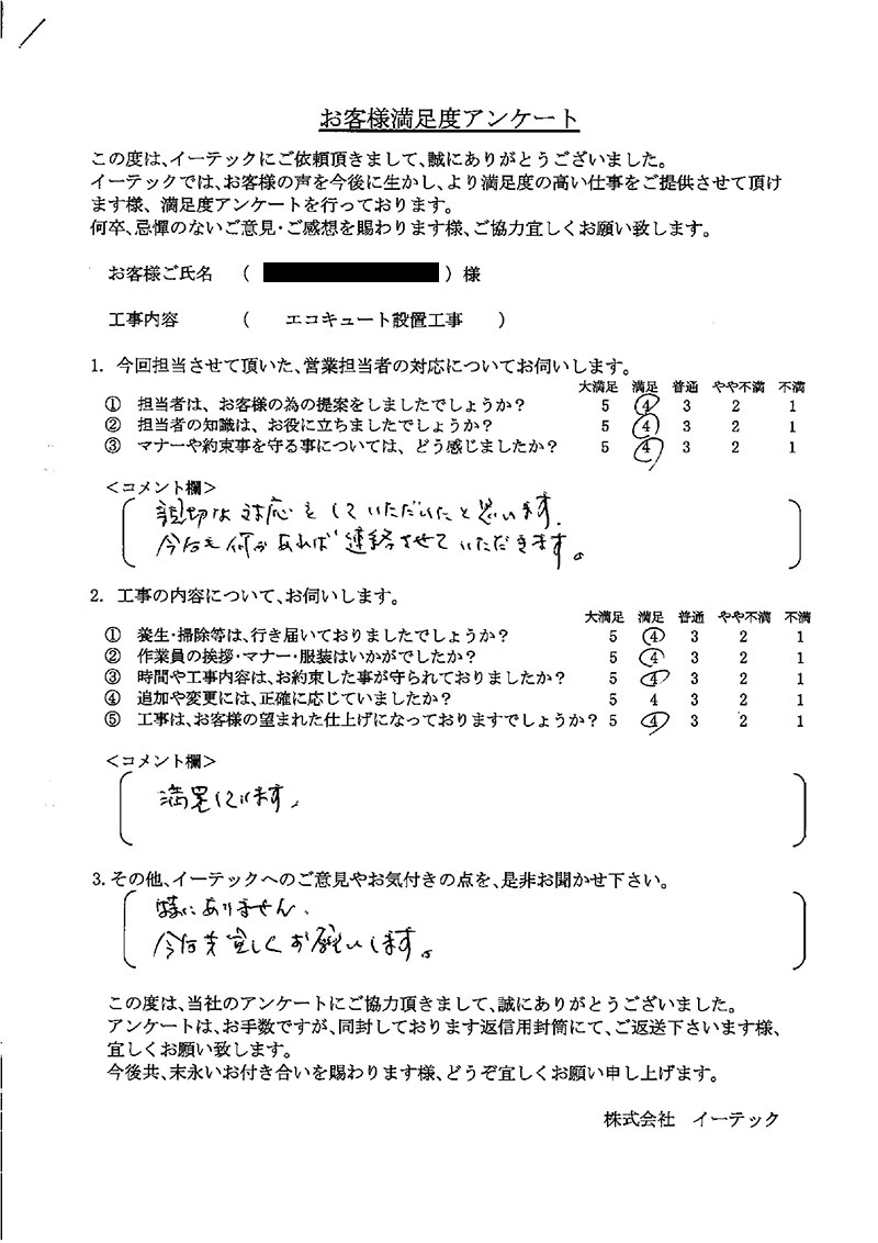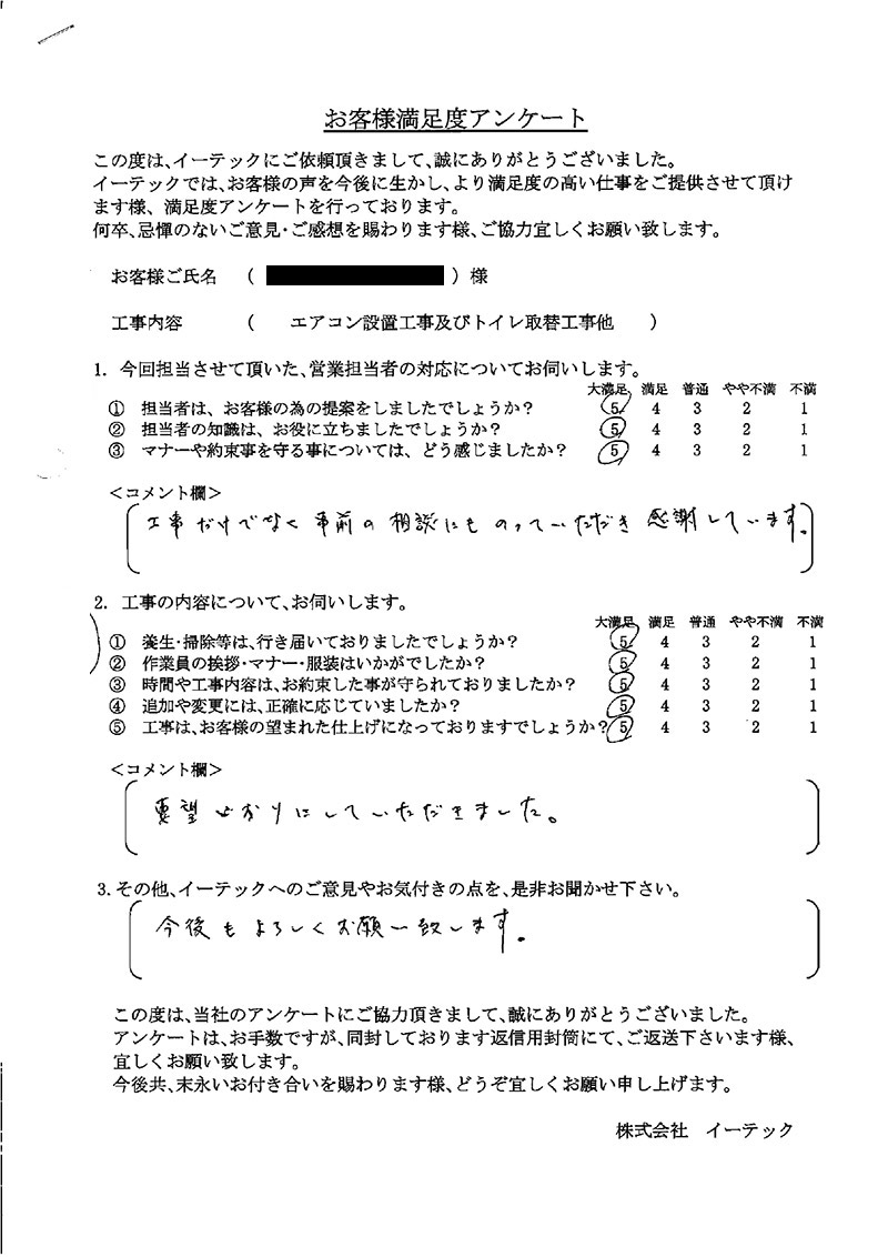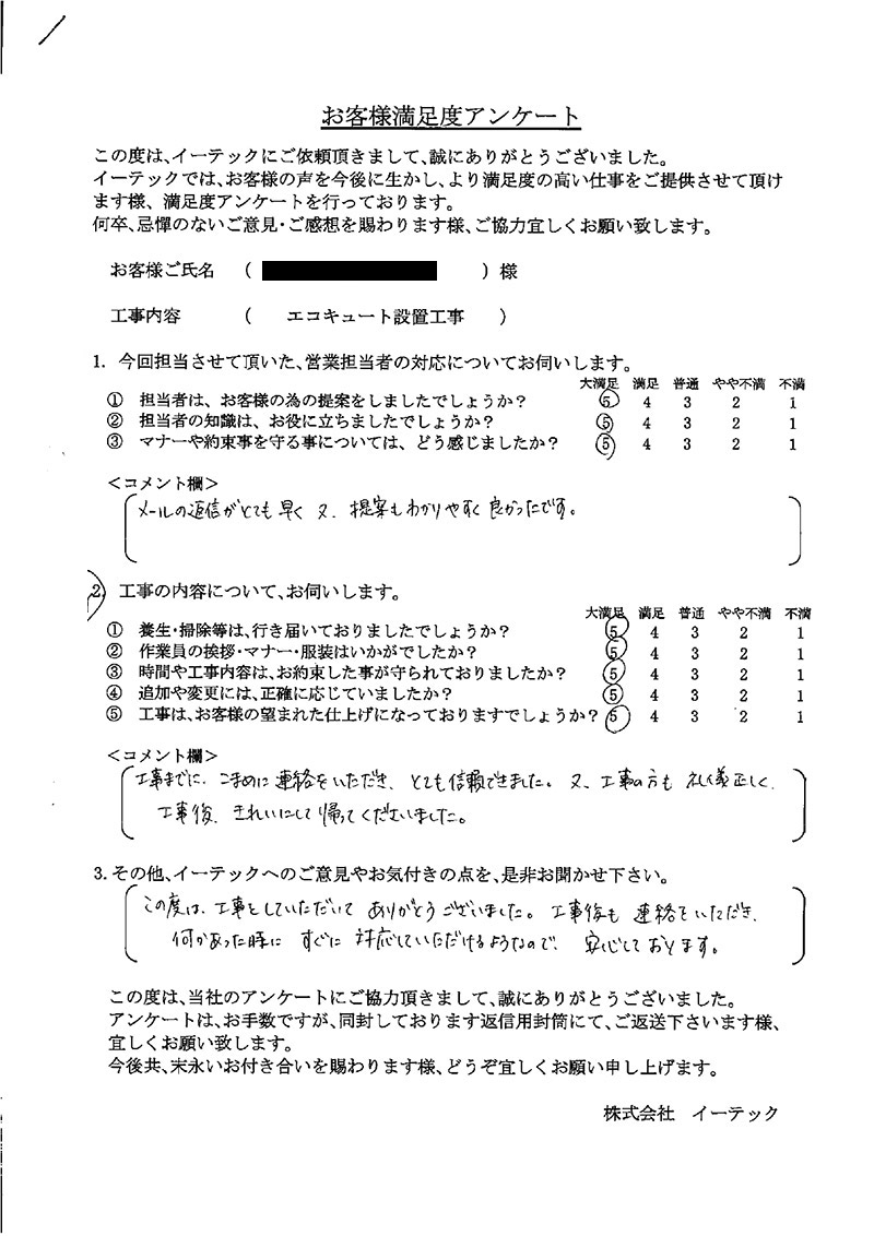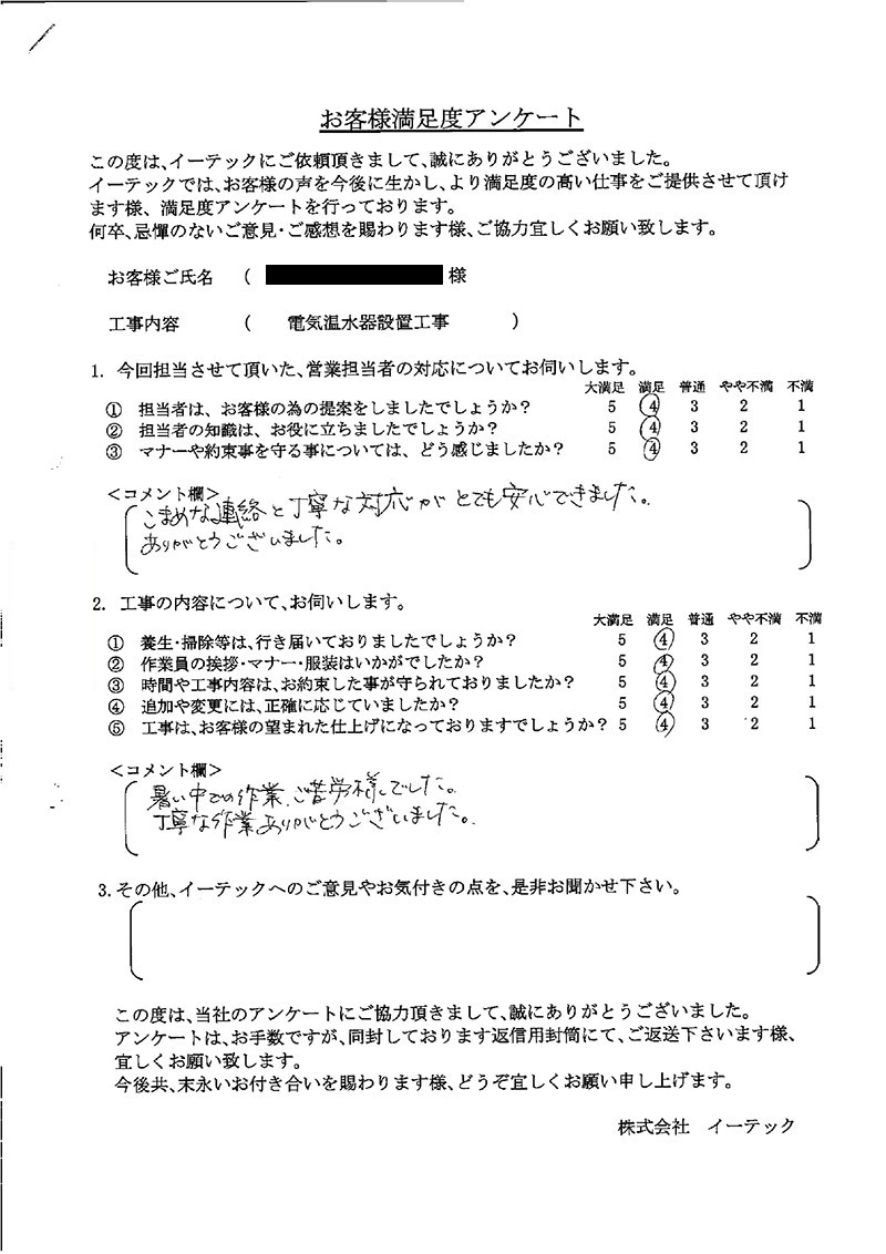 この度は、工事をしていただいてありがとうございました。工事後も連絡をいただき何かあった時にすぐに対応いただけるようなので、安心しております。
