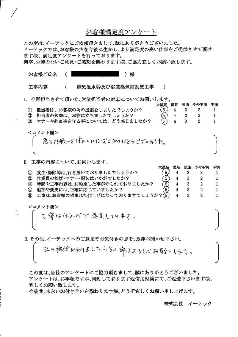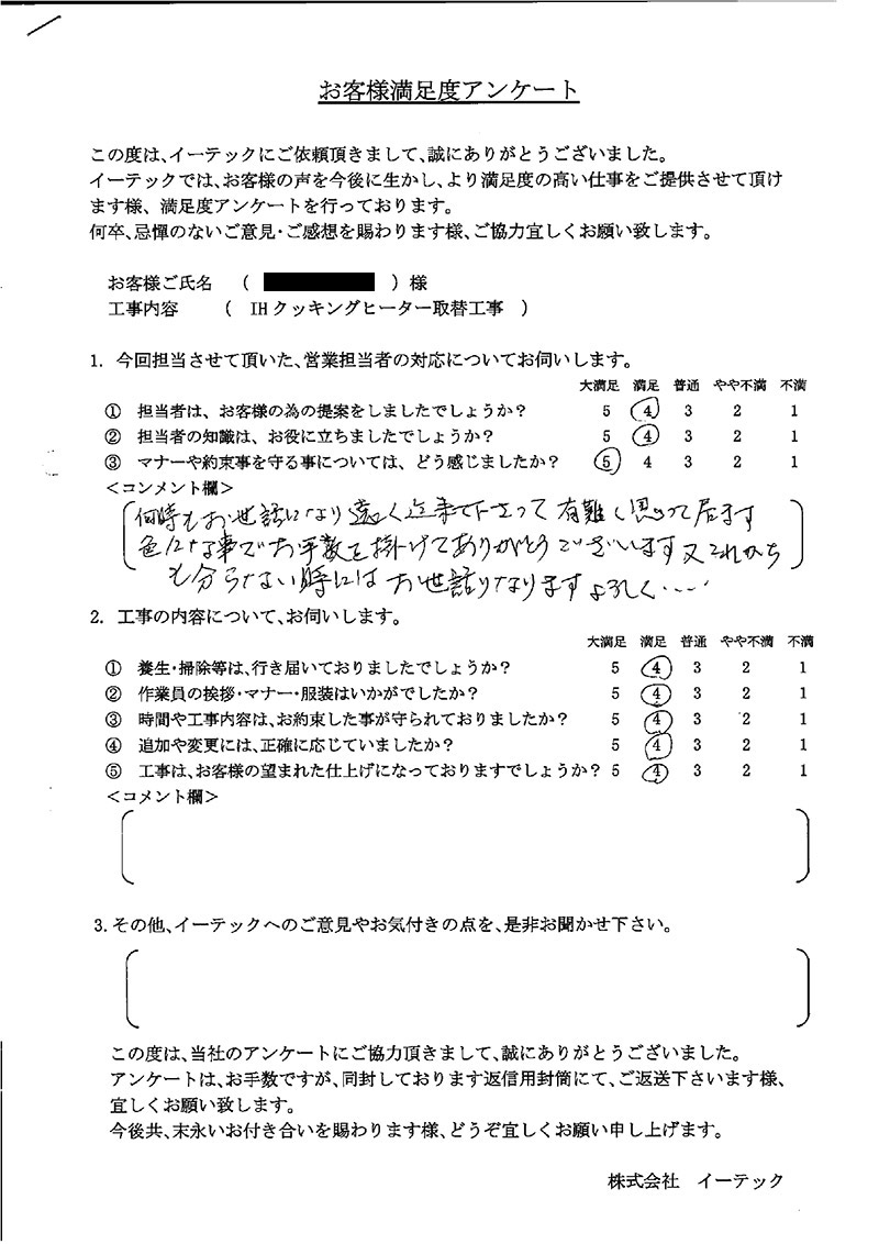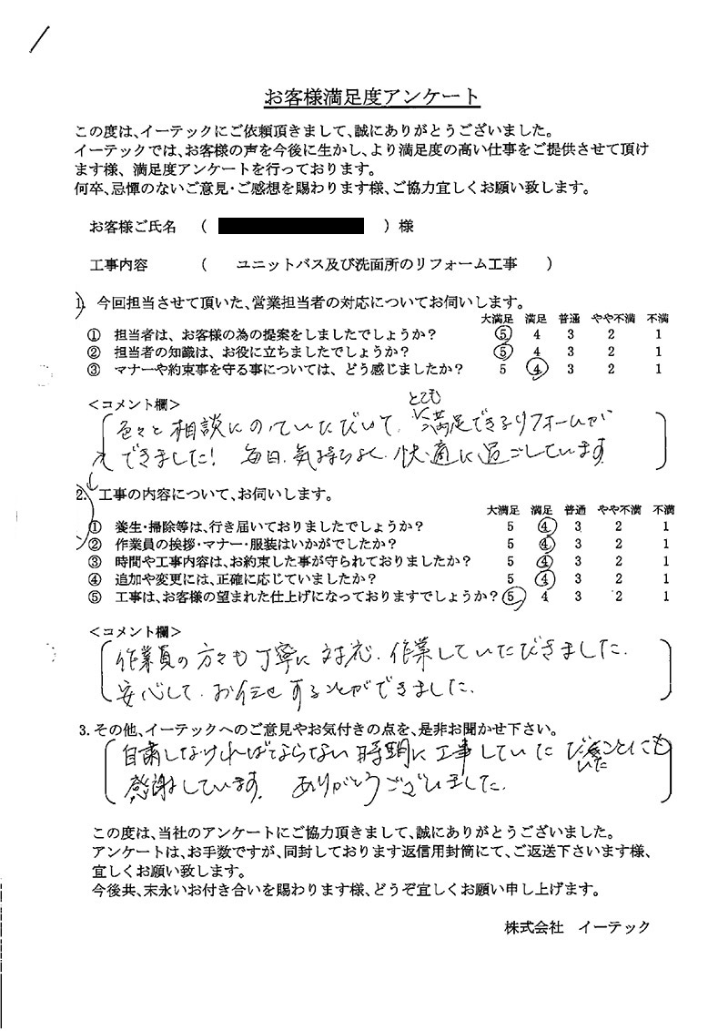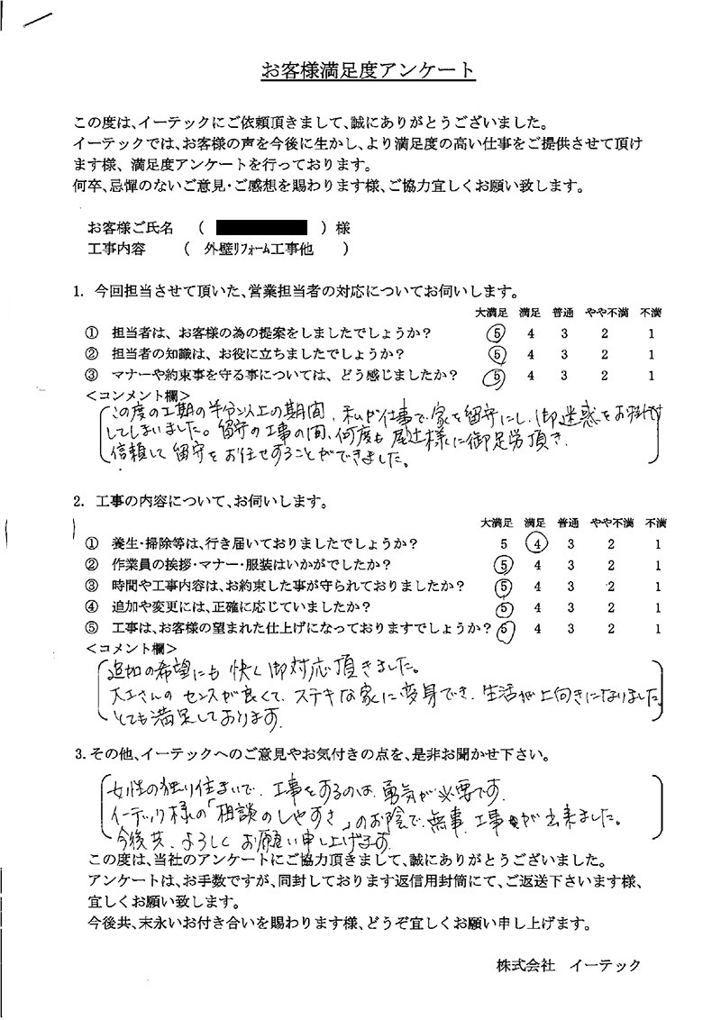 女性の独り住まいで、工事をするのは勇気が必要です。イーテック様の「相談のしやすさ」のお陰で、無事、工事ができました。今後共、よろしくお願い申し上げます。