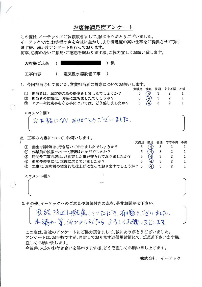 お世話になり、ありがとうございました。凍結防止にも配慮していただき、有難うございました。水漏れ等何かありましたらよろしくお願いします。