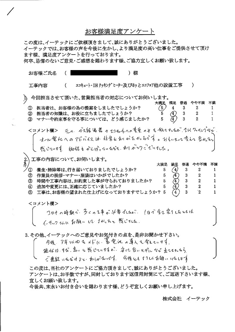 元々ガス給湯器のエコキュートへの変更のみを考えていましたがオール電化へのアドバイスは非常にありがたかったです。おもいきって変えて良かったと感じています。価格もがんばっていただきありがとうございました。