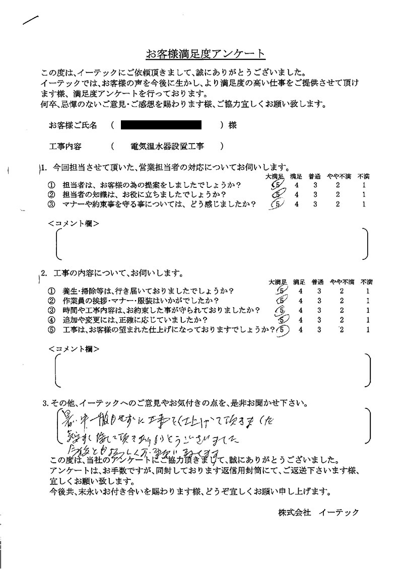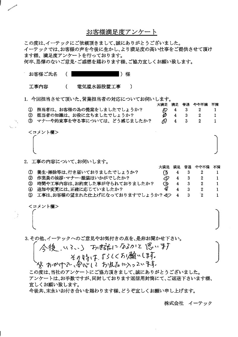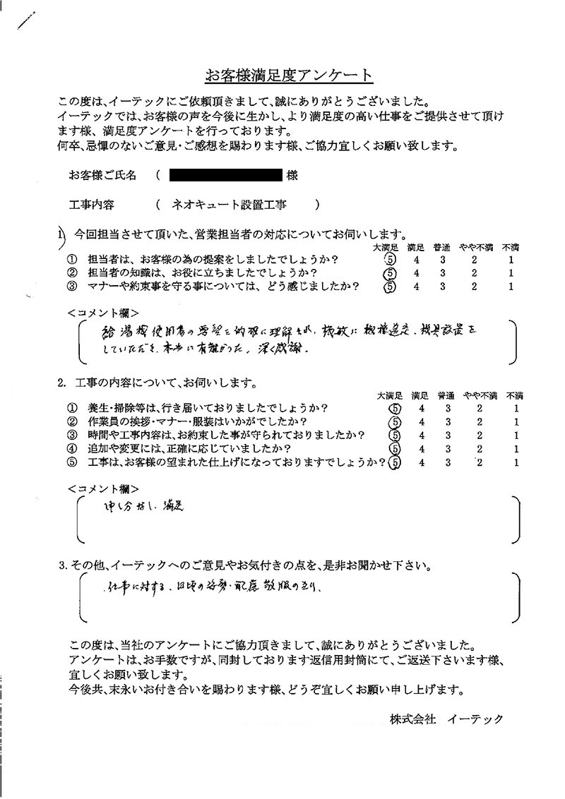 給湯機使用者の要望を的確に理解され、俊敏に器具設置をしていただき本当に有難かった、深く感謝。申し分なし満足。仕事に対する日頃の姿勢、配慮、感服のきり。