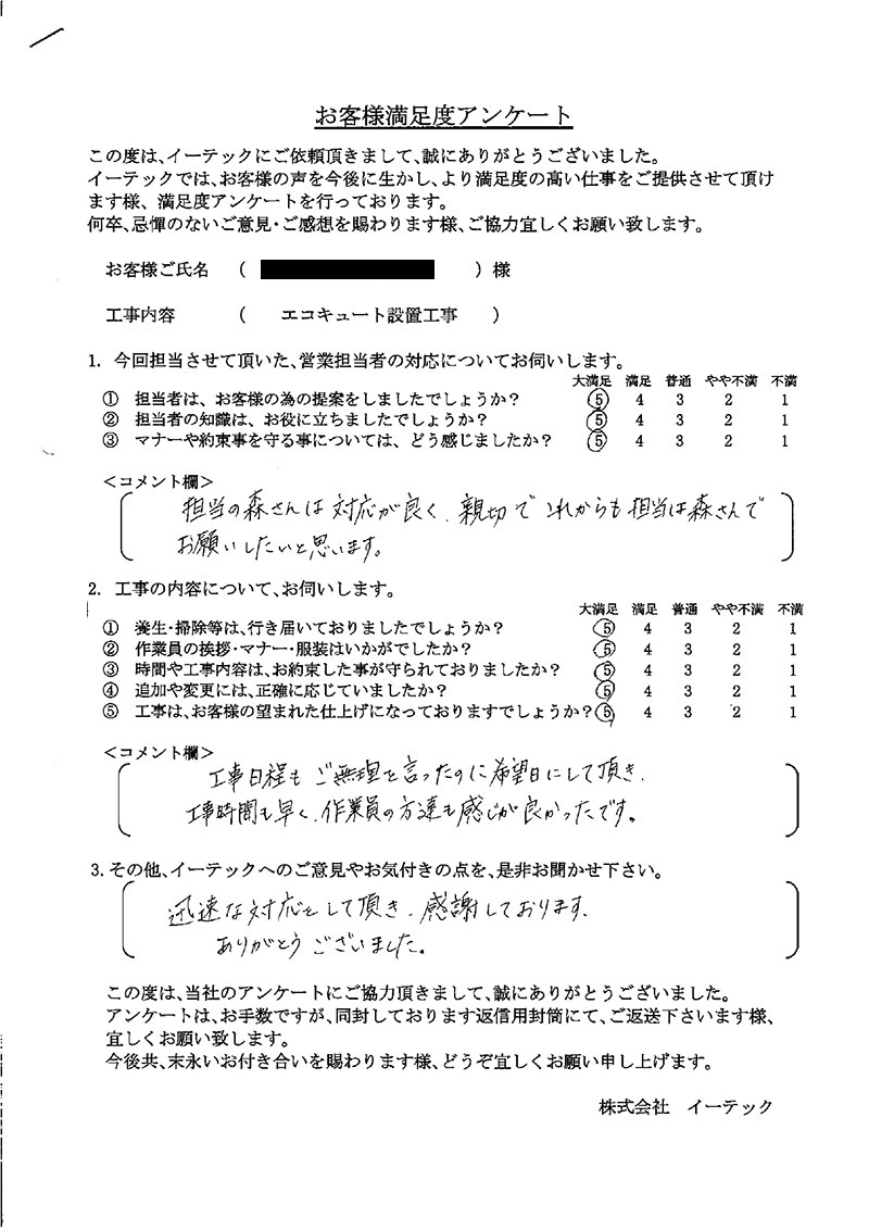 担当の森さんは対応が良く、親切でこれからも担当は森さんでお願いしたいと思います。工事日程もご無理を言ったのに希望日にして頂き、工事時間も早く作業員の方達も感じが良かったです迅速な対応をして頂き感謝しております。ありがとうございました。