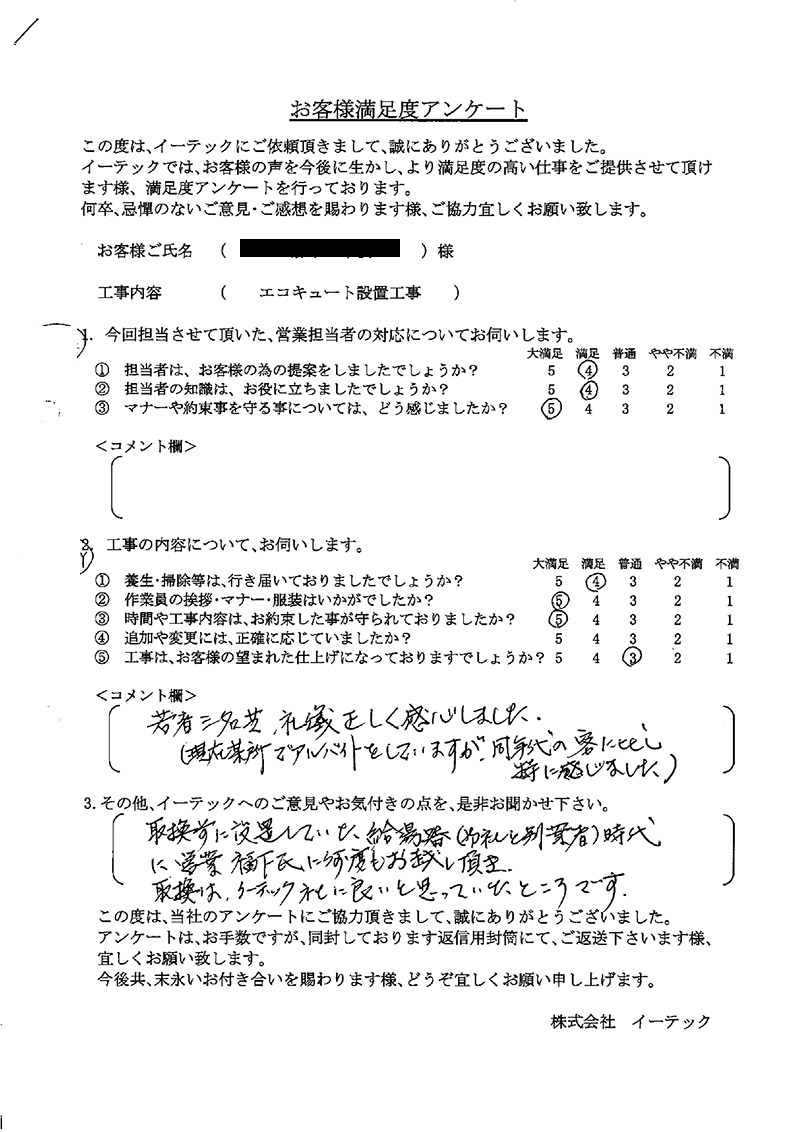 若者三名程、礼儀正しく感心しました。現在某所でアルバイトをしていますが、同年代の客に比較し特に感じました。取替前に設置していた給湯器時代に福下氏に何度もお越し頂き取換はイーテック様に良いと思っていたところです。